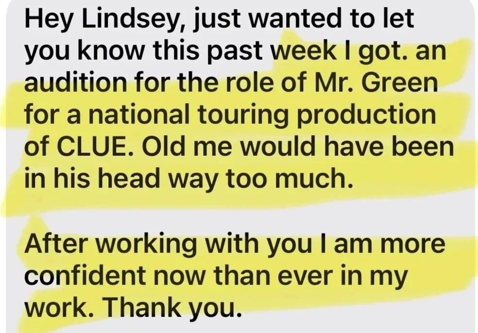 “ Not only did Lindsey recognize my strengths, but more importantly, she helped me address and strengthen my weaknesses. Lindsey is an actor’s director and she knows how to bring the best out of you. If you are efficient at the technical aspects, but struggle with getting out of your head, Lindsey has the tools necessary to take you to the next level of making your craft the best it can be. ”